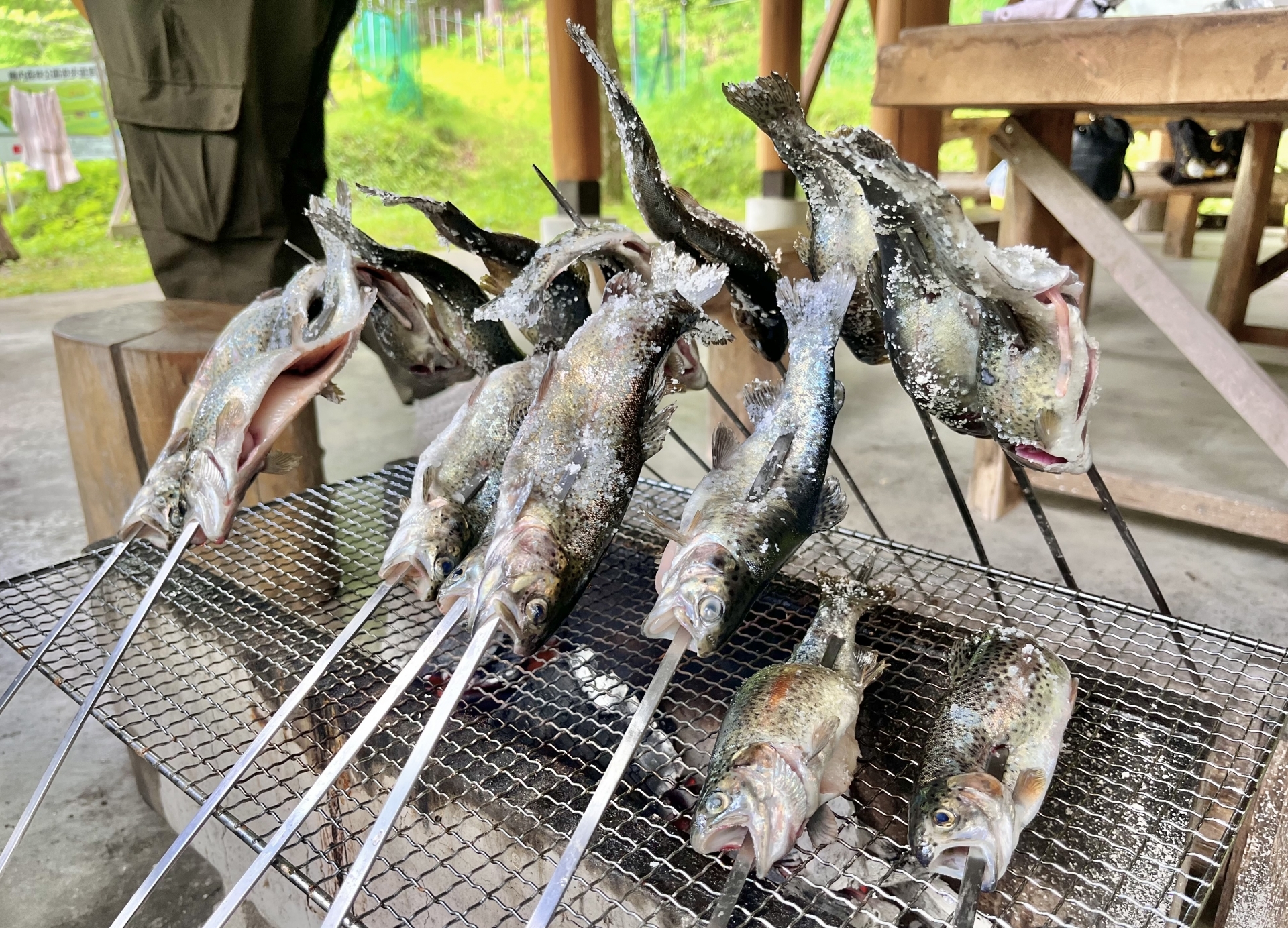澄んだ水の中を泳ぐ元気なニジマスを釣り上げたり、素手でつかみ取ったりできる体験コーナーです。お子さまでも安心して挑戦できるので、家族みんなで大盛り上がり!獲れた魚はその場で炭火焼きにしてお召し上がりいただけます。自分で獲った魚の味は格別ですよ。
